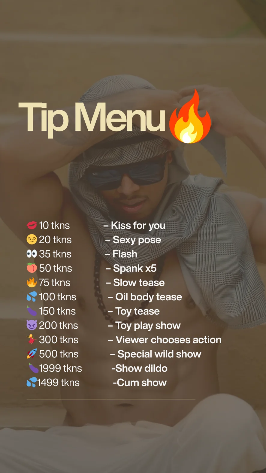 Zezadu, Erotický tanec, Sprcha, Flexing, Sexuální hračky, Penisový kroužek, CEI, Výstřik, Prstění, Deepthroat, Anál, Dildo nebo vibrátor, Kouření, Ponižování, Orgasmus